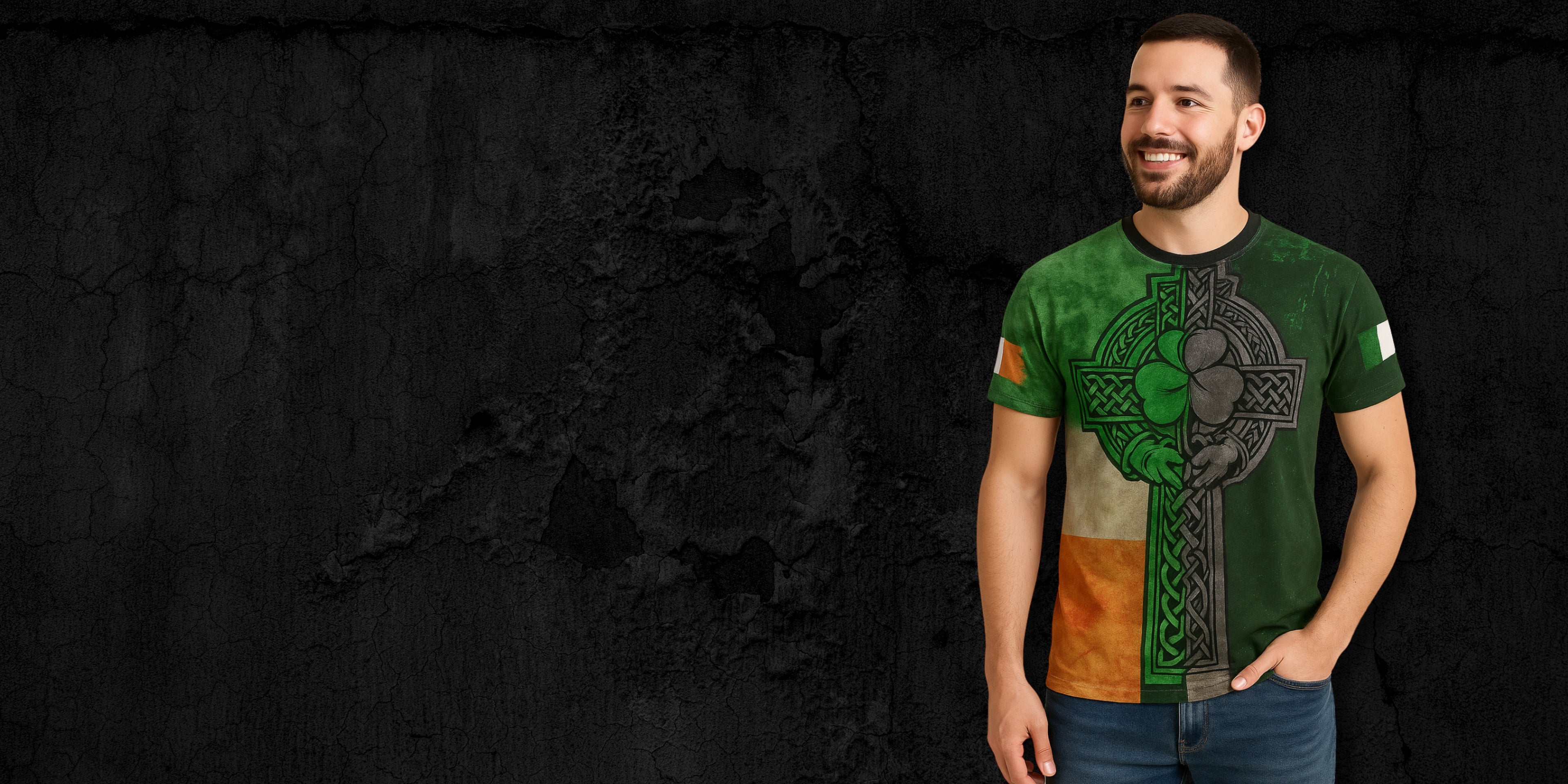 Our men’s tops blend bold Irish symbols with modern streetwear—featuring Celtic crosses, shamrocks, flags, and heritage prints made to stand out.